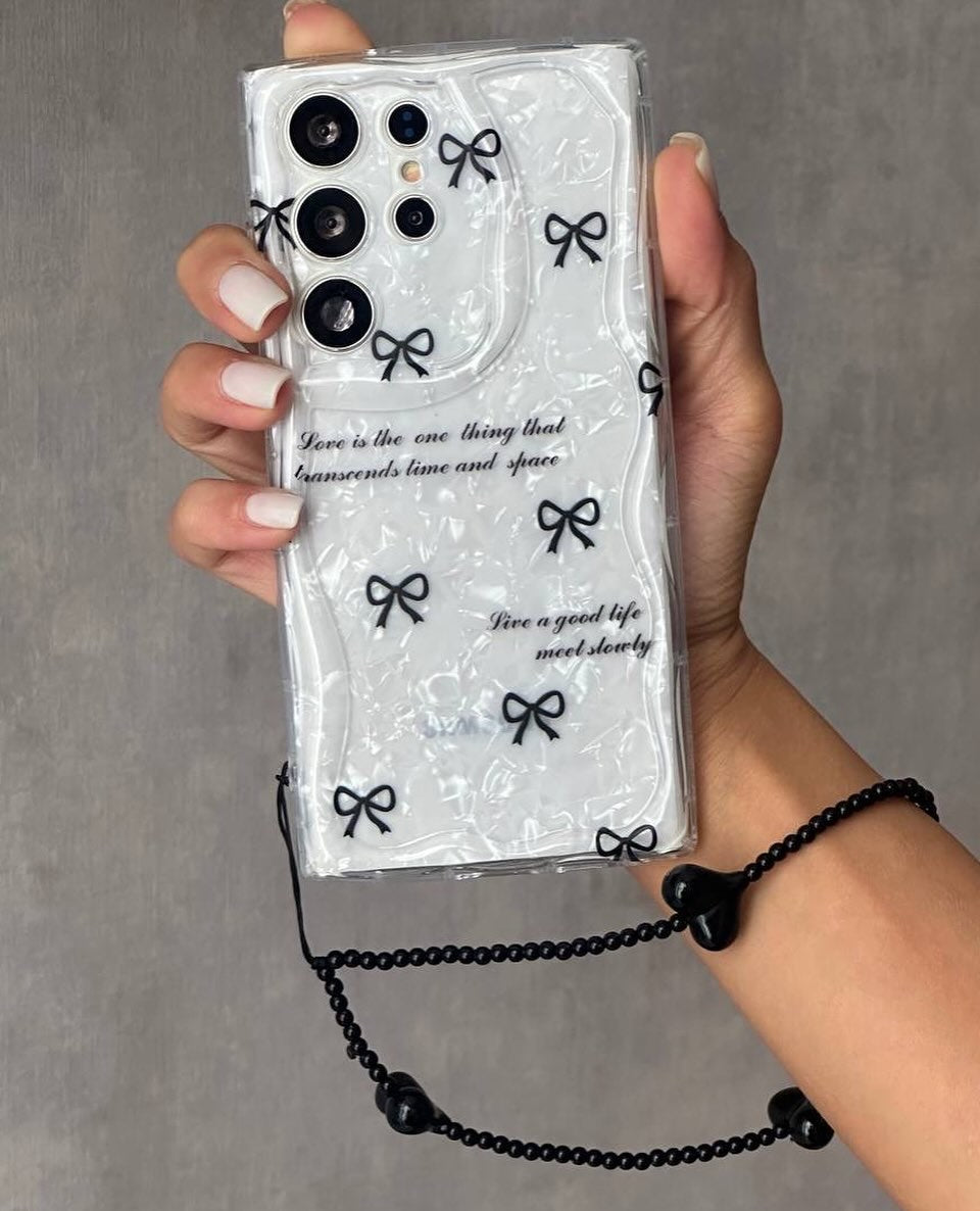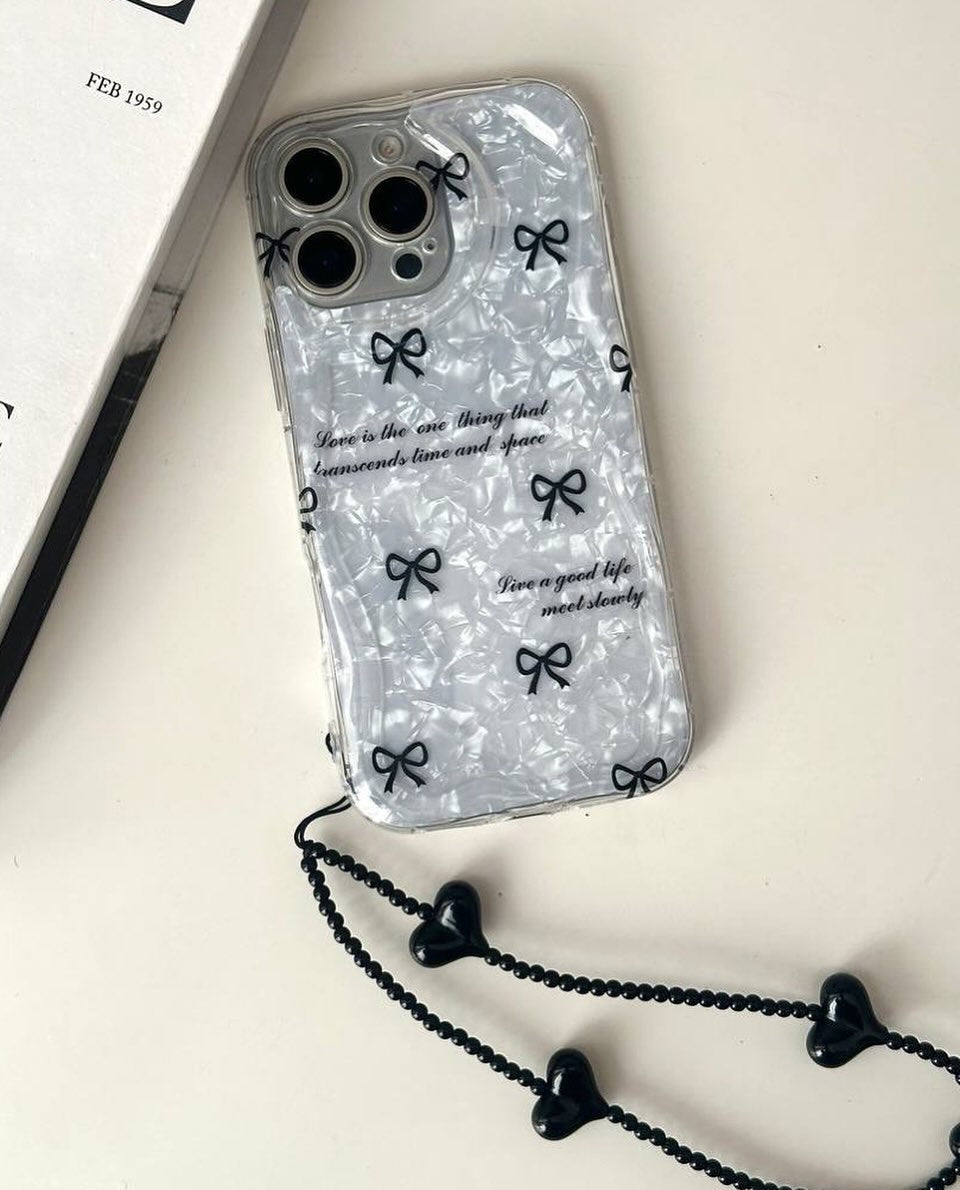 Add a blend of elegance and fun to your phone with the Bow Chubby Shimmer with Hanging Charm case. Designed for style and functionality, this transparent case features chic black bows with a shimmering finish and a playful heart-shaped charm attached via a black bead chain. Perfect for anyone who loves fashion-forward tech accessories, this case fits a wide range of phone models to keep your device looking stunning and protected.